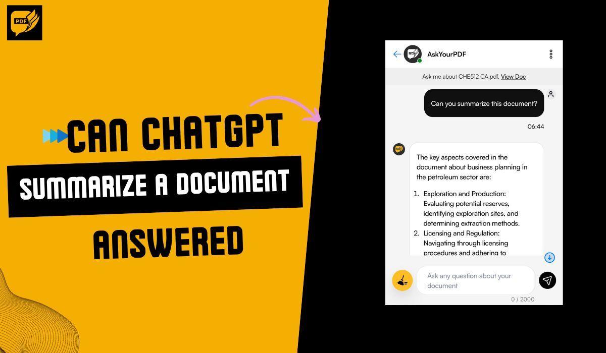 ChatGPT cannot summarize a document directly. However, there are other ways you can summarize a document with or without ChatGPT. These ways include using the AskYourPDF standalone application, the AskYourPDF plugin with ChatGPT, or manually writing a prompt to summarize the copied text.